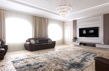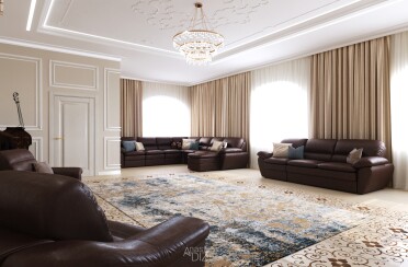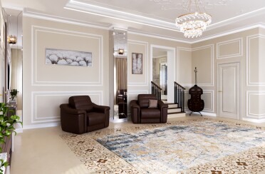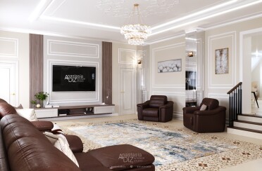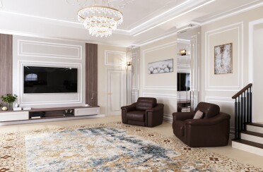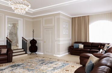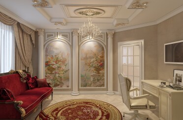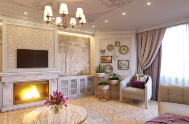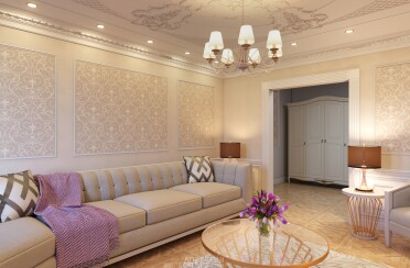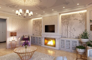 Светлая гостиная / классический стиль / для акцента лепной декор и фрески / 24 кв. м / 2018 г.