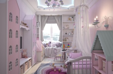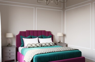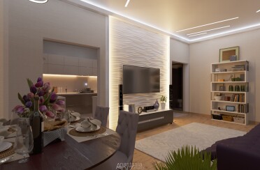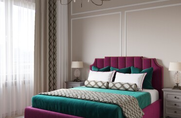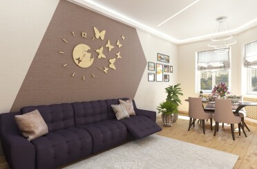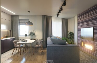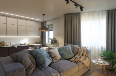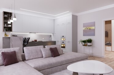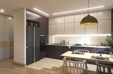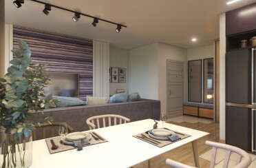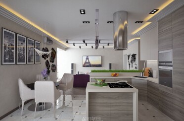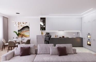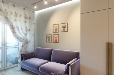 Светлый интерьер / современный стиль / фиолетовые акценты / 67 кв. м / 2020 г.