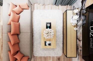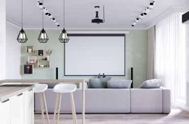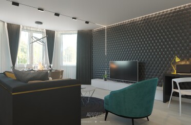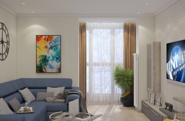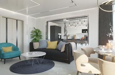 Светлая гостиная / современный стиль / бирюзовые акценты / 45 кв. м / 2020 г.