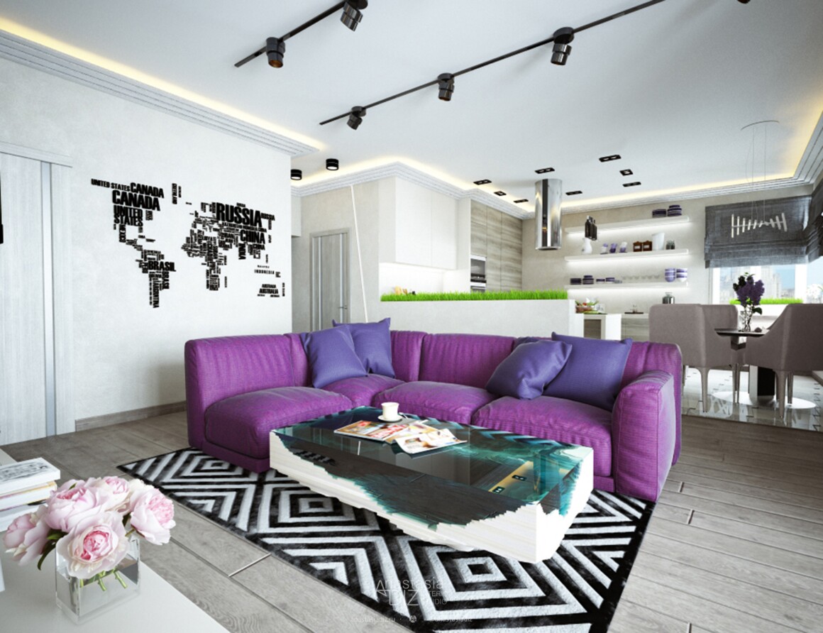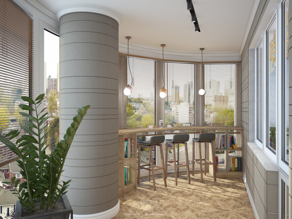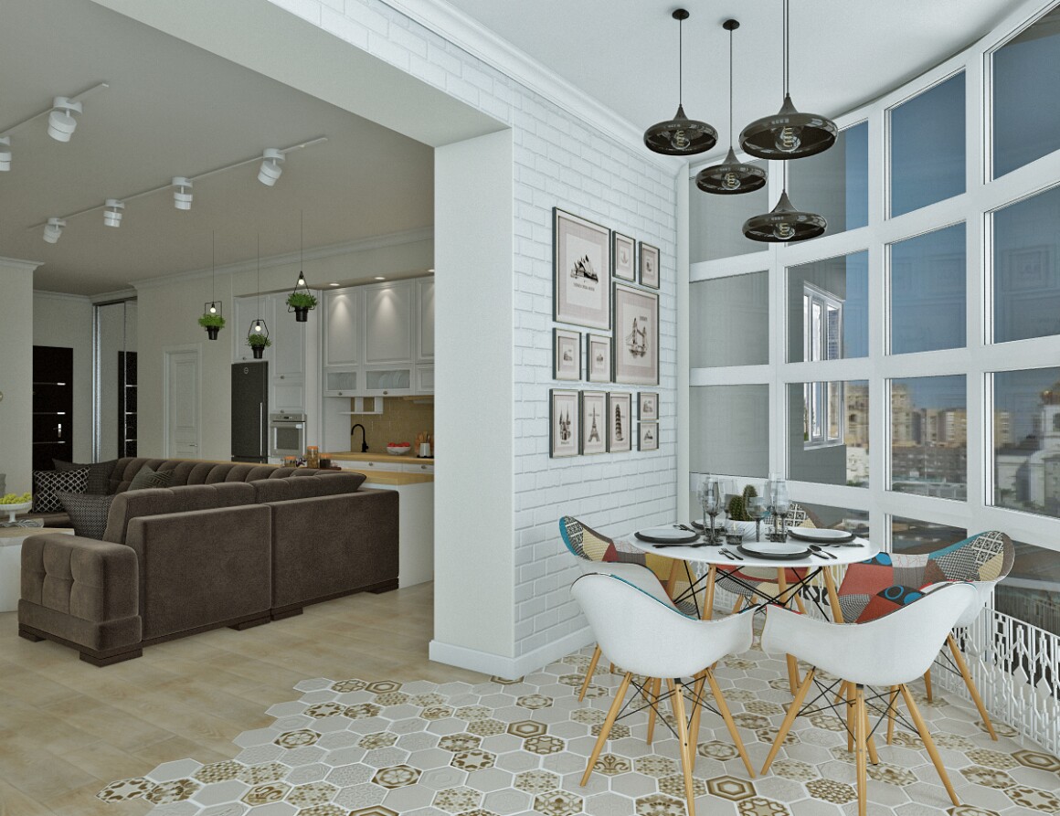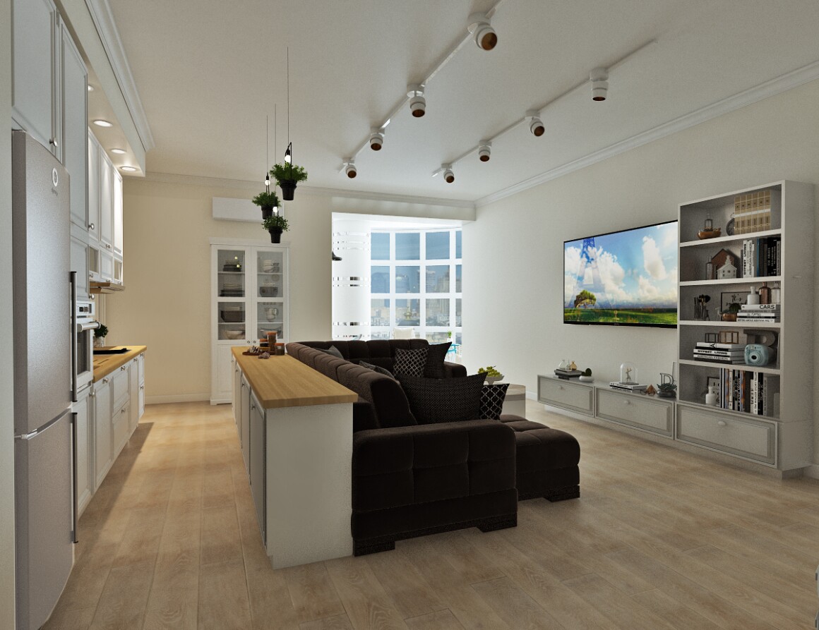 * Меняем расположение мебели в зоне гостиной, добавляем барную стойку, зону балкона берем из первого варианта.