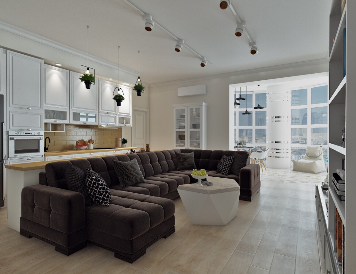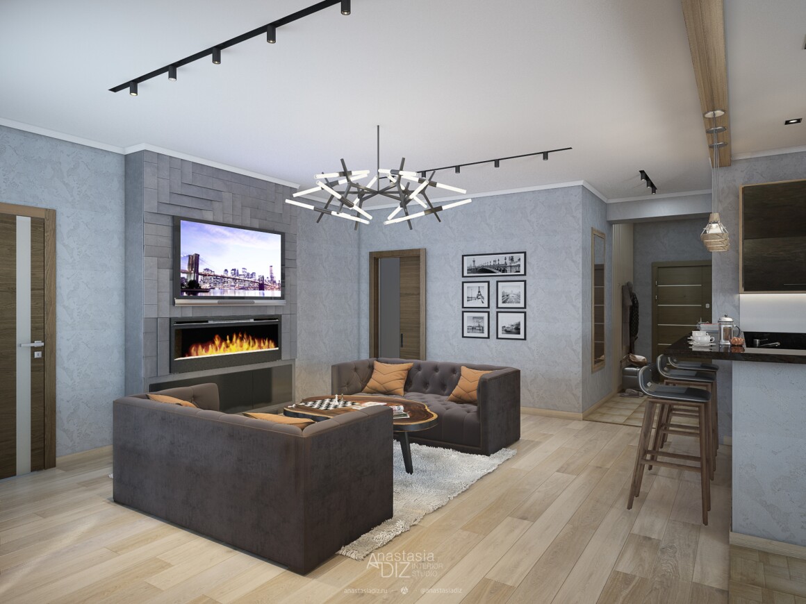 Проект №1 в стили лофт для молодой пары: кухня гостиная и две комнаты.