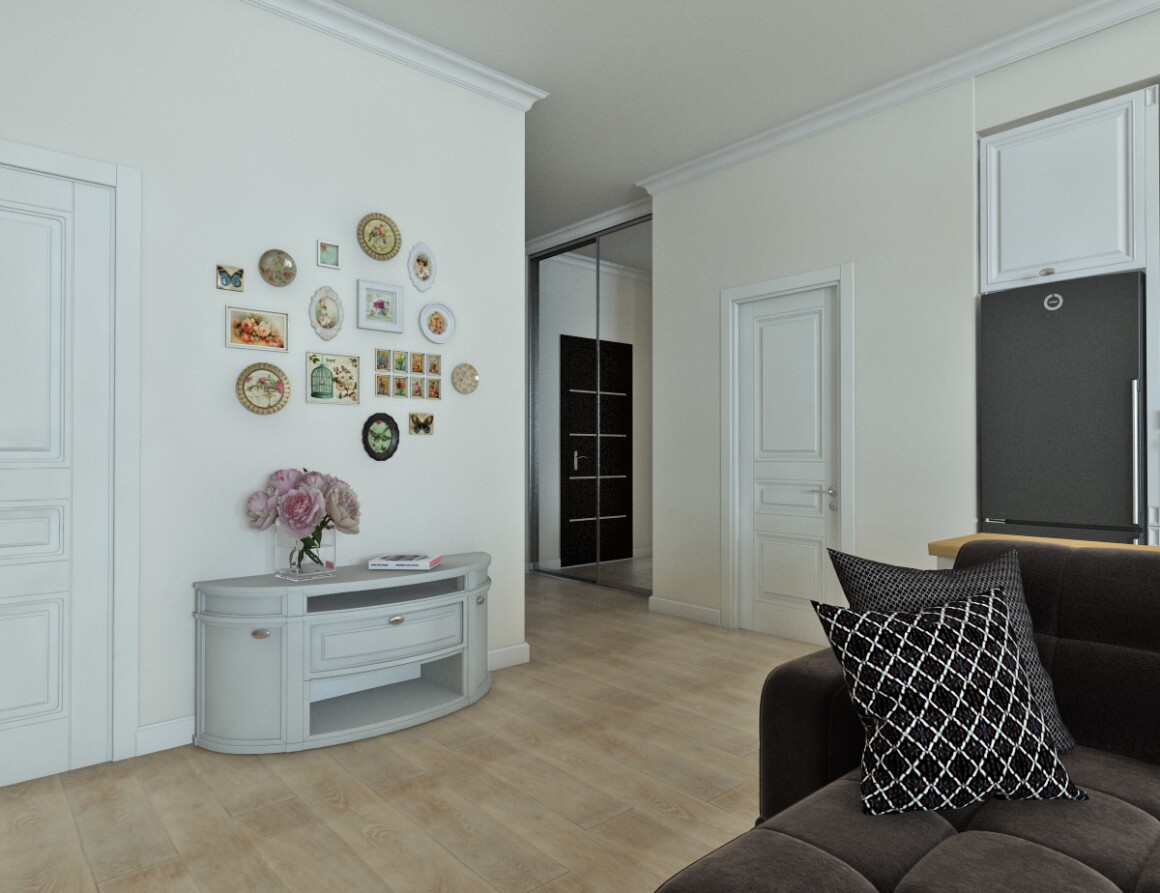 Например, это вторая версия визуализации дизайн-проекта. Изначально плитки в прихожей не было.