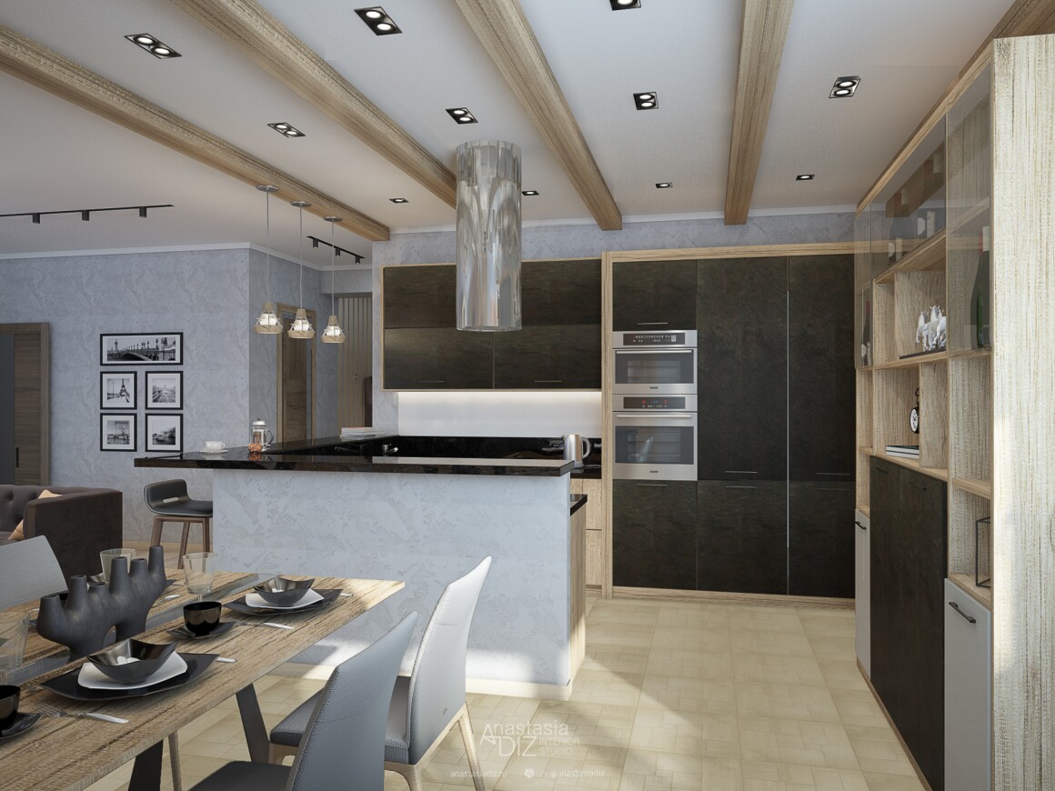 Корректировка: изменить конструкцию потолка гостиной, добавить уровень, в следствии чего меняется высота верхней антресоли у мебели и приходиться менять раскладку фасадов. Стекла на раздвижной перегородки в зону кухни делаем прозрачными.