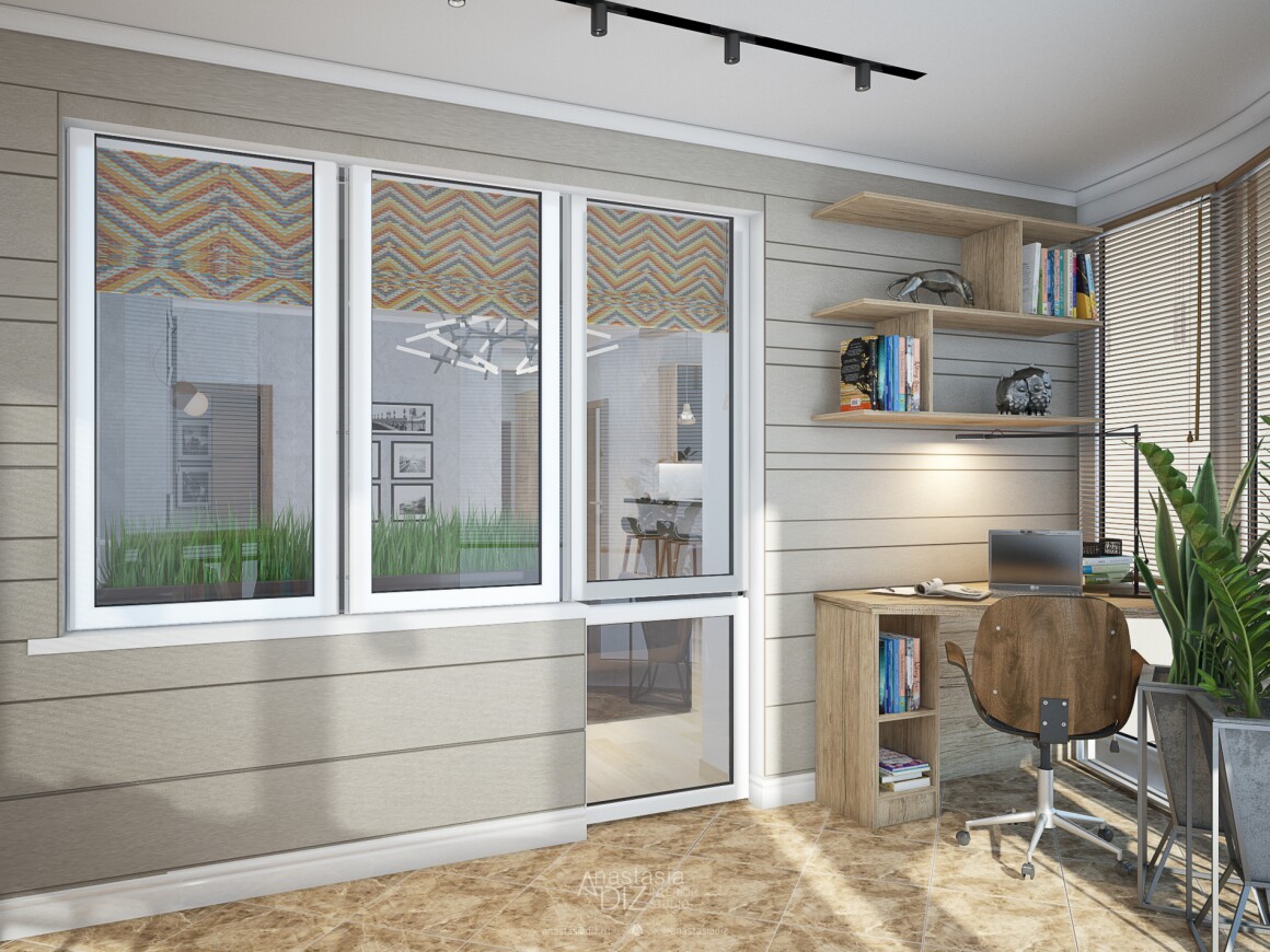 Предлагаем выделить зону спальни перегородкой, переносим стиральную машинку на кухню, кухня плавно переходит в гостиную, обеденный стол меняет свое положение и становится меньше. На балконе рассматриваем еще один вариант зоны отдыха.