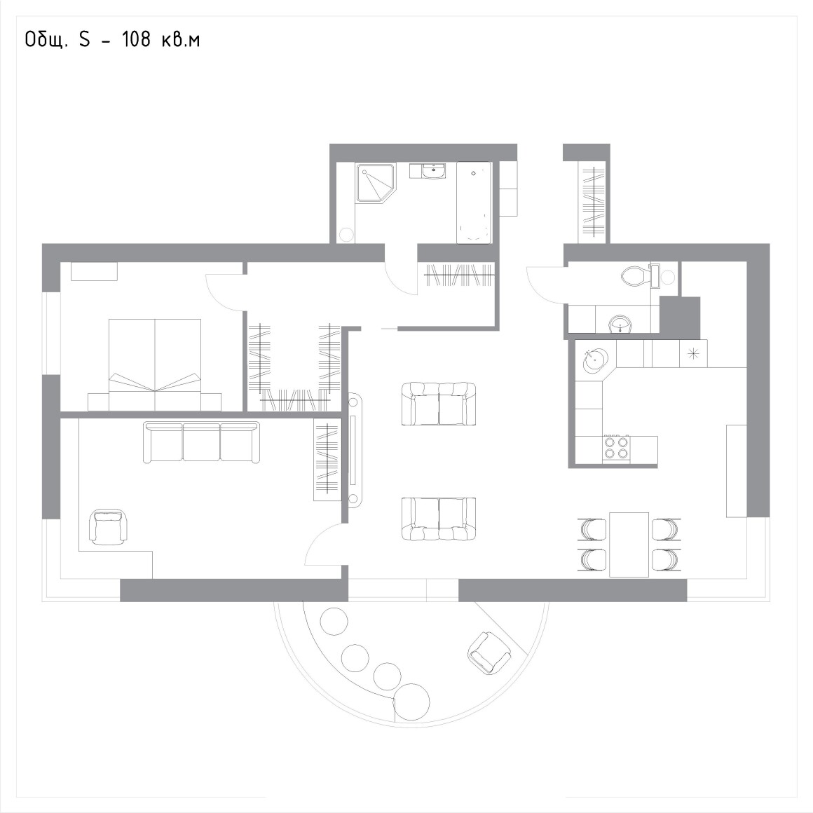 Расположение мебели в ванной комнате берем из 4 варианта, уменьшаем зону кухни и добавляем шкаф, отделенный перегородкой, ТВ-зону берем из первого варианта, обеденный стол — из второго, зону балкона — из третьего.