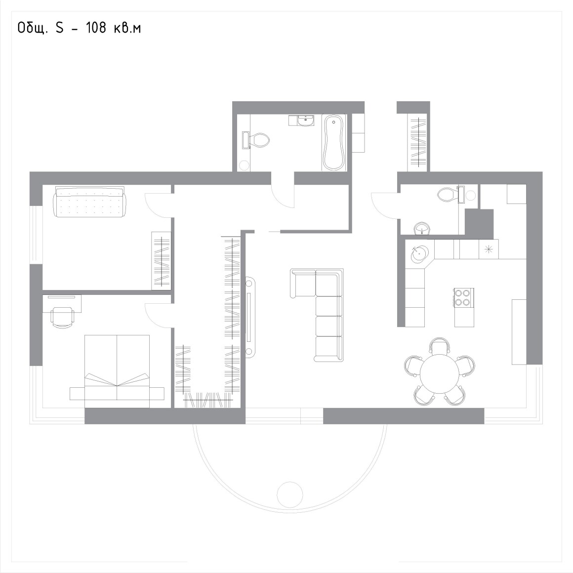* Расположение мебели в ванной берем из 1 варианта, меняем кровать на диван, меняем зону напротив дивана на рабочую.